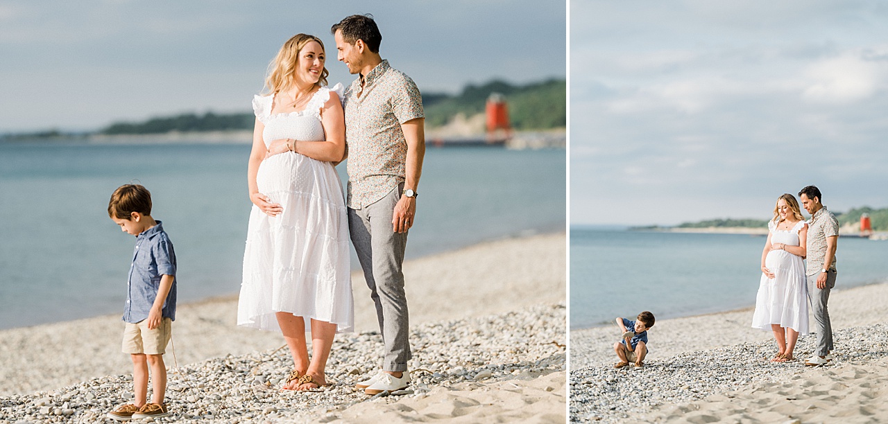 While beside the water, we got some more maternity photos with Cali. The sun setting paints her with golden light. I really had a lot of fun with this blended session. We then took some more fun photos on the rocky beach. Then, we ended our Northern Michigan Family Portraits with shots of the family sitting on the rocks.